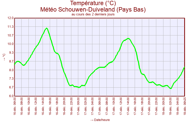 Affichage de graphiques de données météorologiques de la station météo Schouwen-Duiveland, tels que la pression de l'air, température, précipitation, pluie, vent, direction du vent, rafales, etc. Tags: